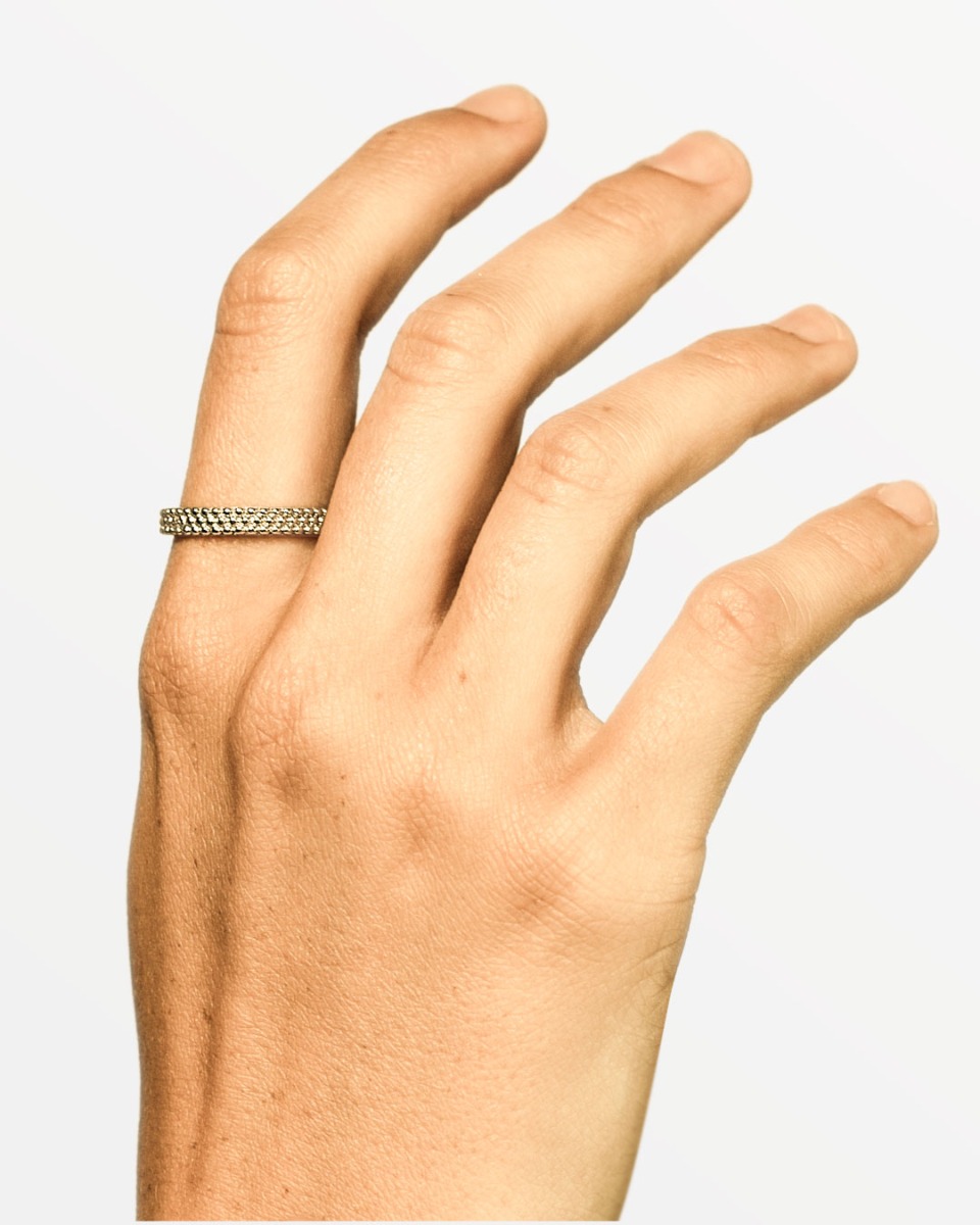 Ring med små runde dutter hele vejen rundt i 3 rækker. Denne ring har ingen sten.