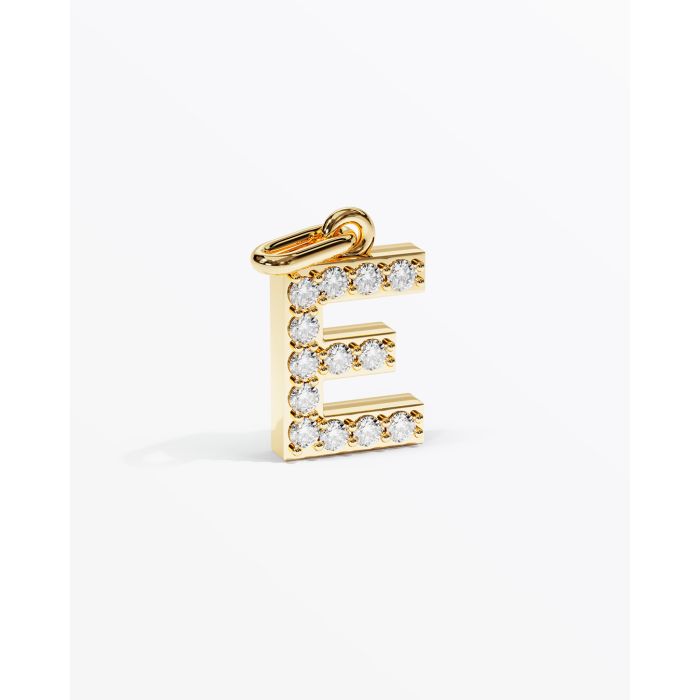Letter E with 13 stones. All stones can be designed individually. Stone size is 1.5 mm. The height is 10 mm. Depth is 2.6 mm.