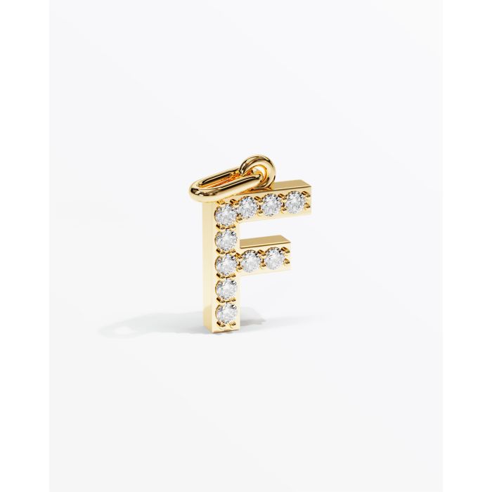 Letter F with 10 stones. All stones can be designed individually. Stone size is 1.5 mm. The height is 10 mm. Depth is 2.6 mm.