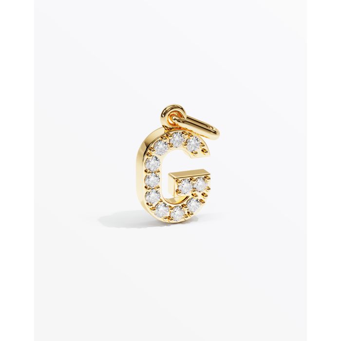 Letter G with 11 stones. All stones can be designed individually. Stone size is 1.5 mm. The height is 10 mm. Depth is 2.6 mm.