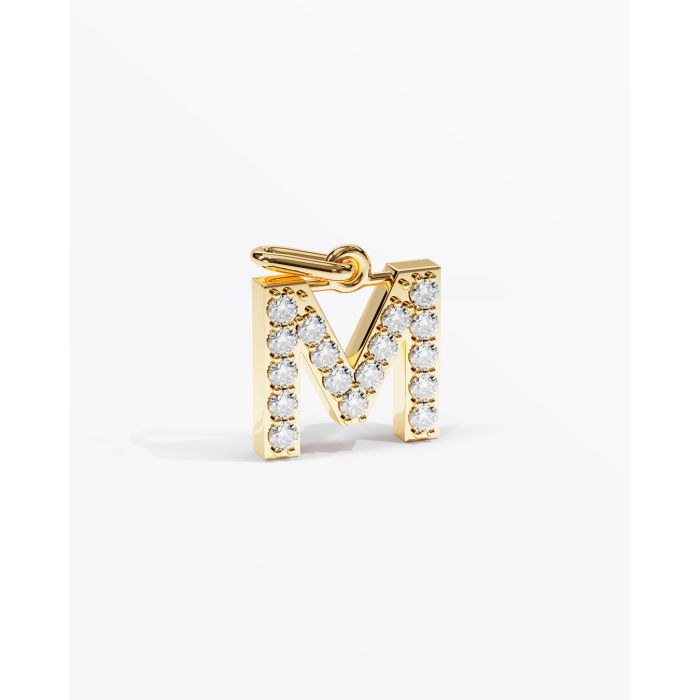 Letter M with 17 stones. All stones can be designed individually. Stone size is 1.5 mm. The height is 10 mm. Depth is 2.6 mm.