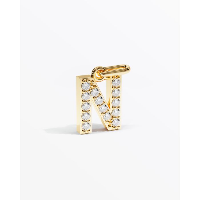 Letter N with 14 stones. All stones can be designed individually. Stone size is 1.5 mm. The height is 10 mm. Depth is 2.6 mm.