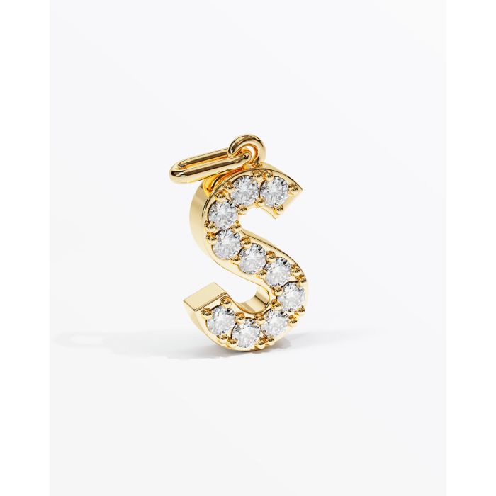 Letter S with 10 stones. All stones can be designed individually. Stone size is 2 mm. The height is 15 mm. Depth is 3.5 mm.