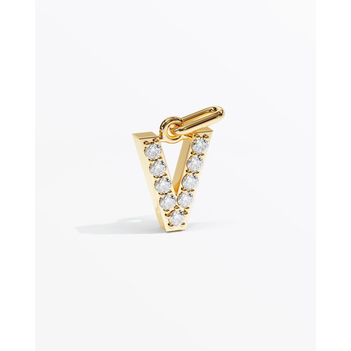Letter V with 9 stones. All stones can be designed individually. Stone size is 1.5 mm. The height is 10 mm. Depth is 2.6 mm.